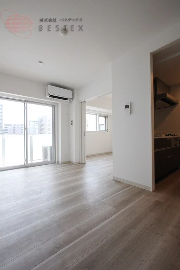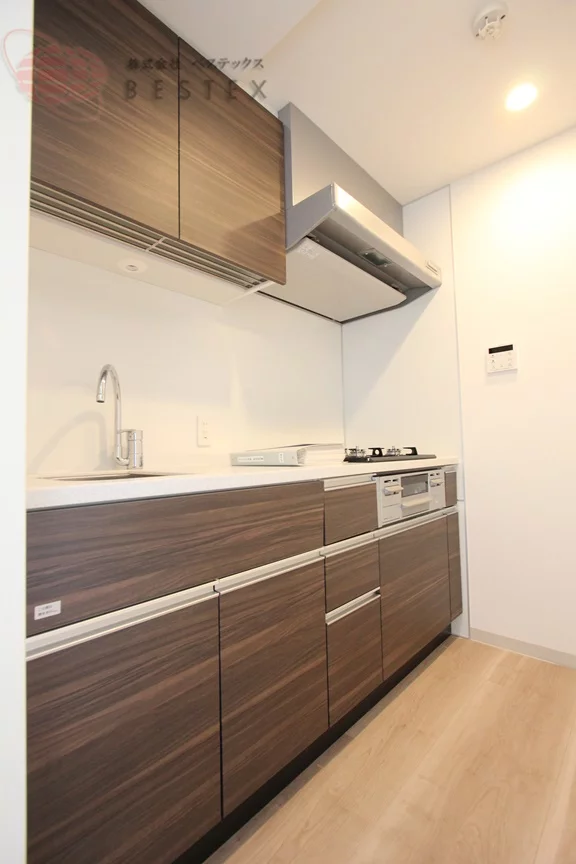 居住空間のメインとなるリビング・ダイニング(LD)は約7.2帖の広さがあり、南向きのバルコニーに面しているため、豊かな自然光が差し込む明るい空間となっています。室内は、本質繊維を原料とする成型板に木目調の樹脂シートを貼った「シートフローリング」仕様となっており、お手入れのしやすさと木の温もりを両立させています。キッチンは約2.5帖の独立したスペースにあり、料理の効率を高める3口ガスコンロとグリルを完備したシステムキッチンを採用しています。