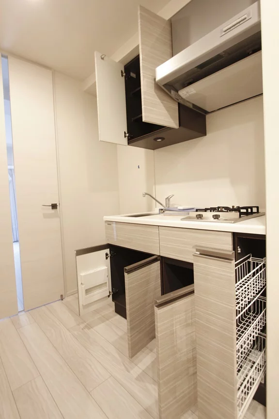 キッチンは、二口ガスコンロで縦型に設置されているので、調理スペースも確保されております。冷蔵庫・電子レンジもキッチン横に置けるので効率にお料理を進める事ができます。