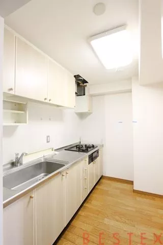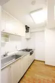 洋室に入って右手の奥は3.8帖のシステムキッチン。料理好きにはたまらない、ビルトインの2口ガスコンロにグリルがついています。調理スペースとシンクも広いため、まな板作業も水作業もゆとりをもって行えます。