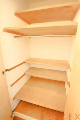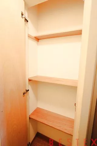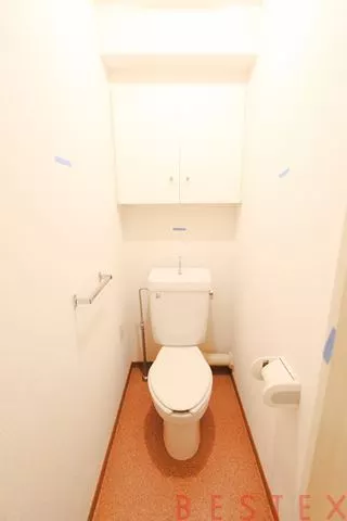 洗面所に入った左右には扉があり、右にはトイレ、左には浴室に繋がっています。嬉しいバストイレ別で、トイレ右手にはラック型の収納、奥には戸棚型の収納があります。トイレには珍しい大容量の収納です。トイレットペーパーや掃除用具などを収納できます。