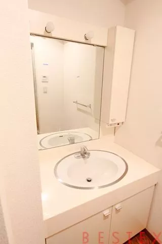 洗濯機の反対側は洗面所。こちらも個室タイプで、中には独立洗面台が設置されています。洗面台の左側と下部は収納で、歯磨きや洗顔用具を奥スペースがあります。使い方によっては、タオルなどを置いてもいいかもしれません。