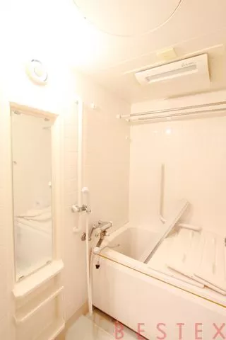 浴室は広々としたシステムバス。大きな姿見には棚がついているので、シャンプーなどのボトルを置くことができます。またお風呂好きには嬉しい追い焚き機能と、浴室乾燥機が設置されています。