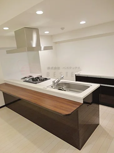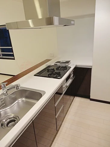 ■キッチンには人工大理石の天板を採用。調理時の使い勝手も良い2口ガスコンロを装備したシステムキッチンとなっております。