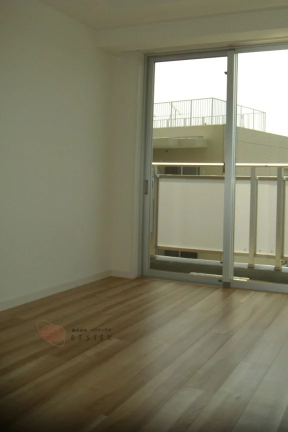 洋室の奥のバルコニーも広々。ただし、向いは学生寮ということと、2階のお部屋ということもあるので、景色はよくありません。ただ向かいの学生寮は低層なので、日当たりは良好。南向きということもあり、昼間の照明は必要なさそうです。