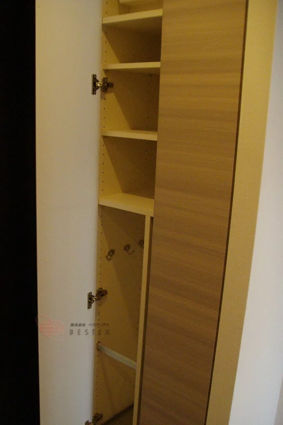 洗面所を出て斜め向かいはトイレ。手洗い付きの便器が設置され、壁にはタオル掛けもあります。使った後にすぐ手を洗えるのが便利です。便器の上部には、収納戸棚も設置されています。