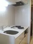 2口ガスコンロつきシステムキッチンございます。吊棚やキッチン下の収納もついており、キッチンまわりの収納はばっちりです。