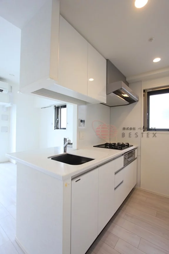 居室は南向きとなっており、また高層階になるので日当たり・眺望が良好となっております。お部屋は振り分けタイプで約8.4帖のリビングと約4.6帖の居室となっており、収納はウォークインクローゼットと大容量です。キッチンはリビングと対面式のカウンターキッチンで調理スペース・収納スペースが十分されており、冷蔵庫・電子レンジもキッチンスペースにおけるので、効率的にお料理を進めることができます。また3口コンロとお料理好きには嬉しい設備となっております。トイレは完全セパレートのウォシュレット機能付きトイレで2人入居でも使い仕様となっております。