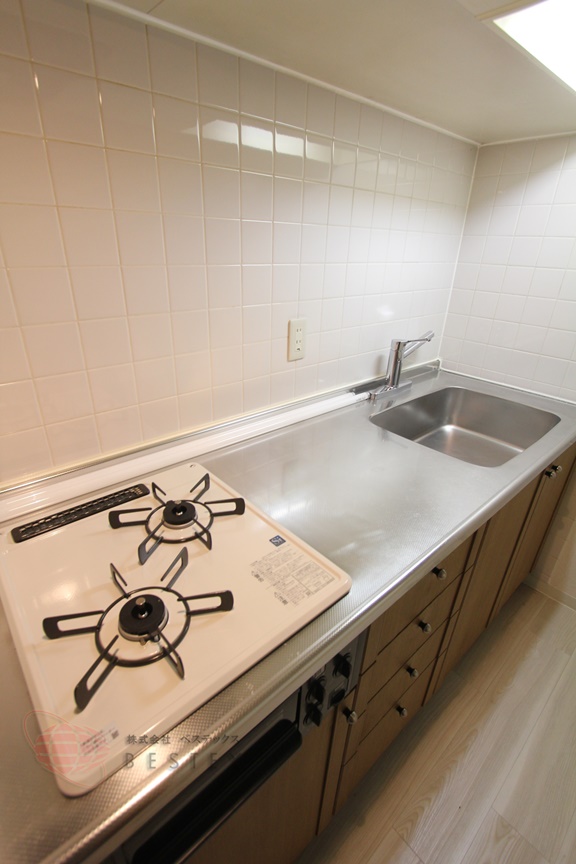 ①.キッチンは2口ガスコンロ+グリル付きのシステムキッチンで調理スペースも確保されております!