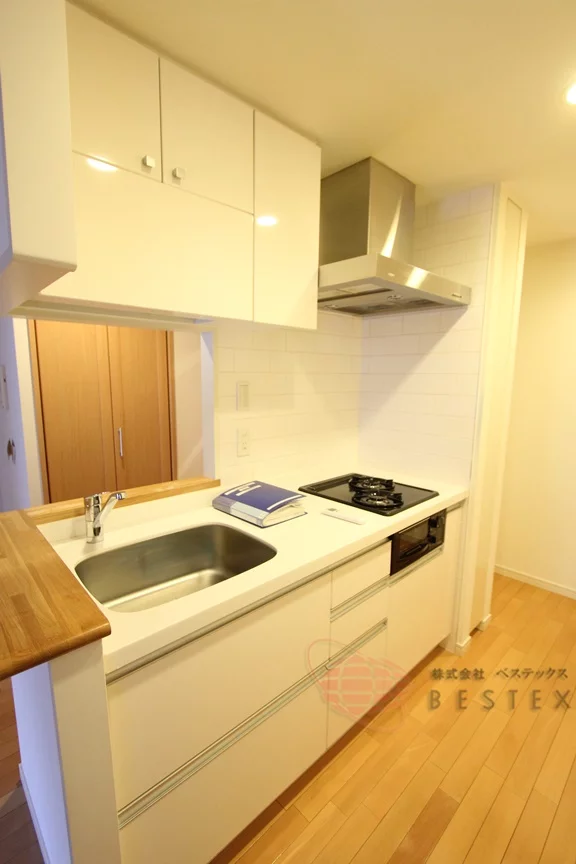キッチンはガス2口コンロ完備のシステムキッチンはオシャレなカウンターキッチンタイプ。
