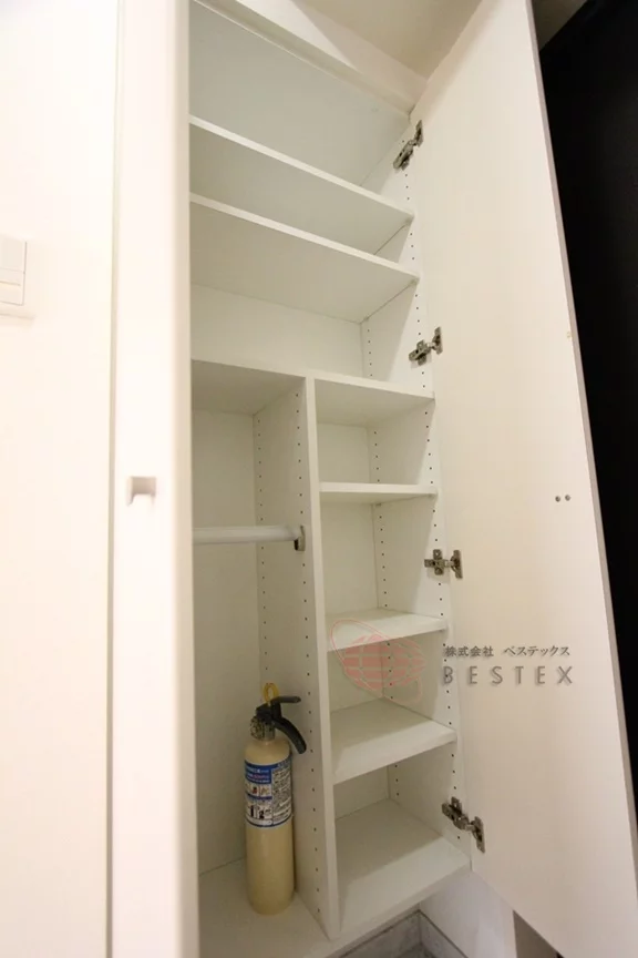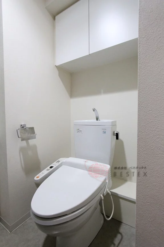 水まわりの設備もしっかりしており、トイレには温水洗浄機能付き。快適に使用できるだけでなく、吊戸棚といった収納も完備!