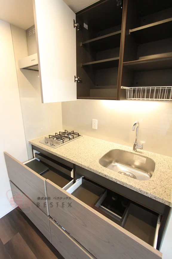 しっかり2口ガスコンロですので、料理を作られる方も安心ですね。シンクとガスコンロの間もしっかり空いているのでまな板も置けるスペースが確保されています。