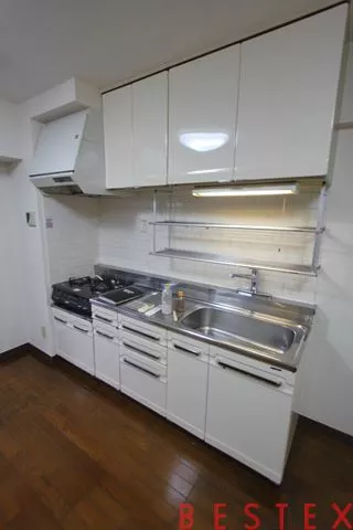 キッチンは2口ガスコンロ設置済み。料理の際に役立つこと間違いなし。
