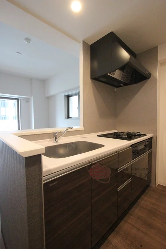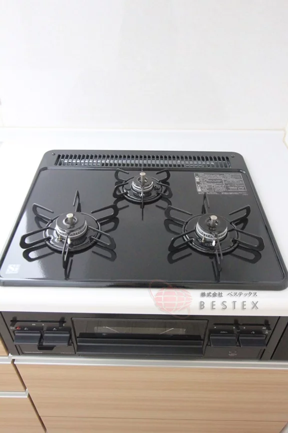 キッチンは、カウンタータイプで3口ガスコンロの調理スペース・収納スペースを十分にされており、冷蔵庫・電子レンジもキッチンスペースに置けるので効率的にお料理を進めることができます。