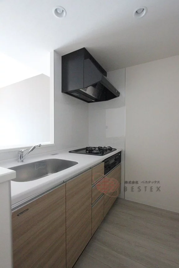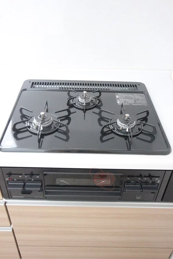 キッチンは、カウンタータイプで3口ガスコンロの調理スペース・収納スペースを十分にされており、冷蔵庫・電子レンジもキッチンスペースに置けるので効率的にお料理を進めることができます。