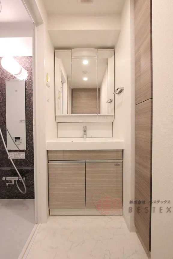 水周りも綺麗で三面鏡仕様の独立洗面台がございます。トイレの位置は玄関付近と2人入居でも生活しやすい造りとなっております。