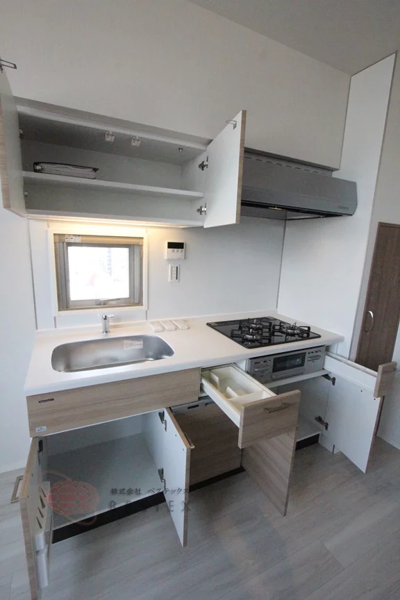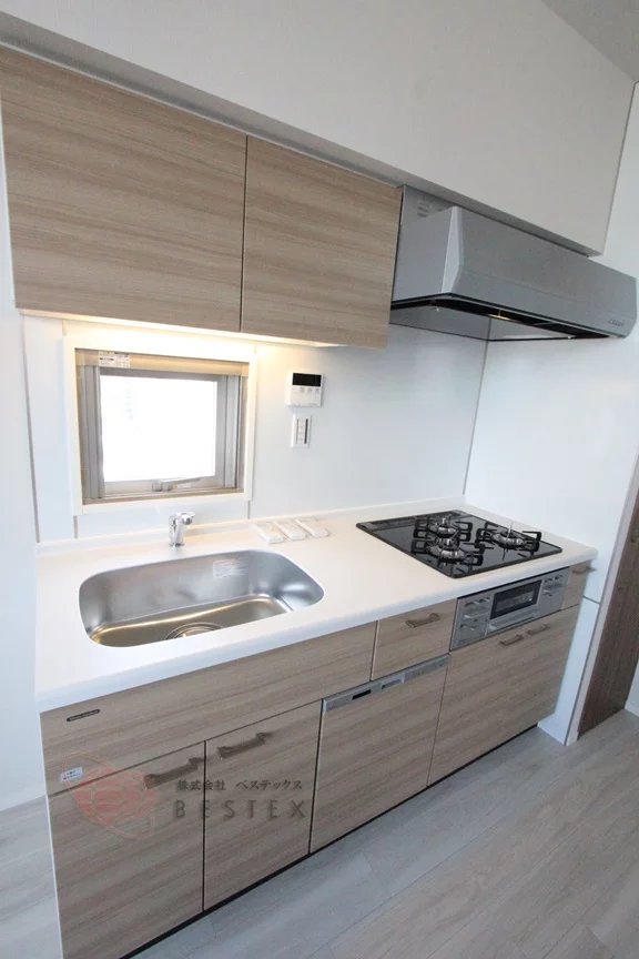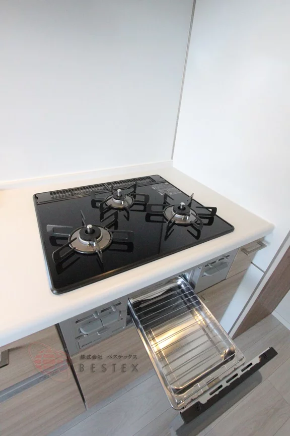 ①.キッチンは3口ガスコンロ+グリル付きのシステムキッチンです!