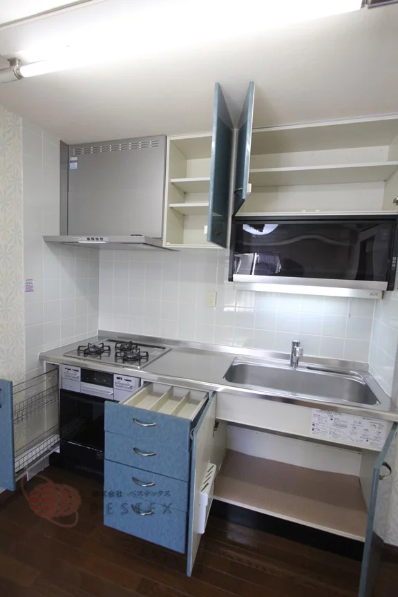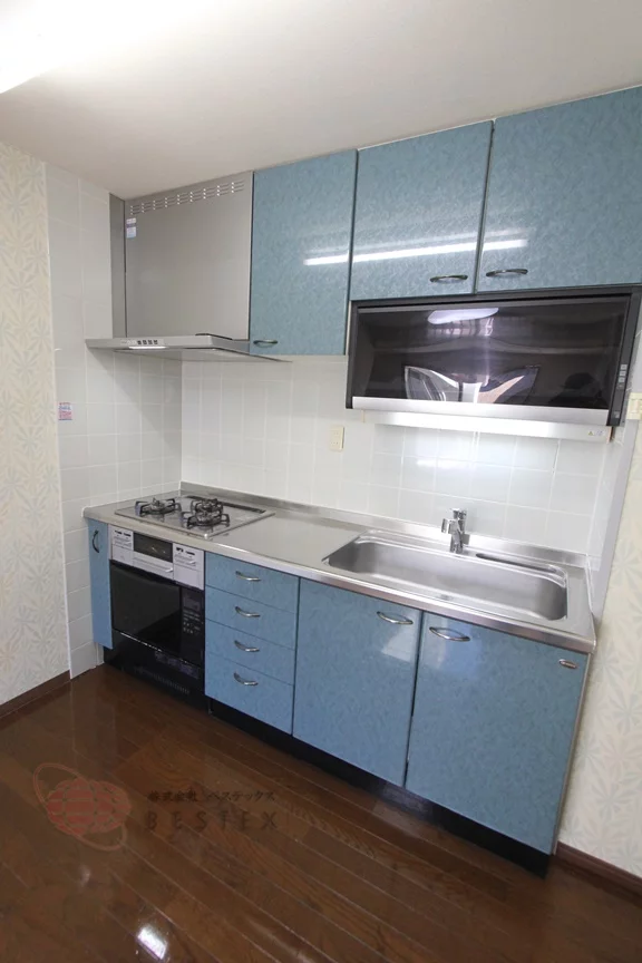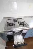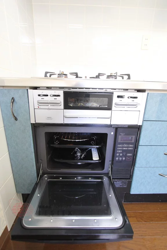 ①.キッチンは、3口ガスコンロ+オーブン+グリル付きのシステムキッチン!!
