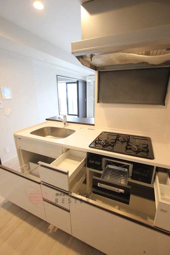 キッチンスペースも広くリビングと対面式で使いやすい仕様となっております。3口ガスコンロで調理スペース・収納スペースが十分に確保されております。
