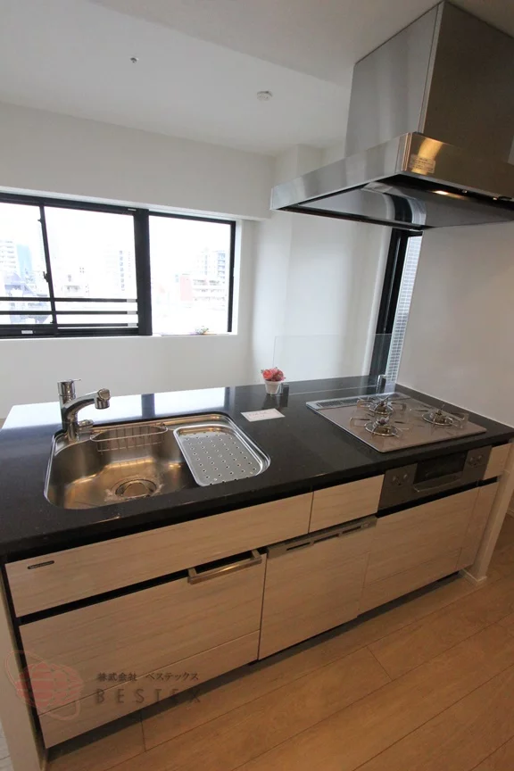 ①.キッチンは、3口ガスコンロ+グリル付きのシステムキッチン!