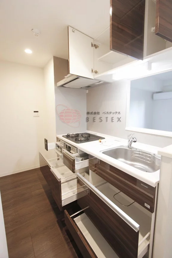 3口ガスコンロのリビングと対面式のカウンターキッチンでリビングの方とコミュニケーションを取りながらお料理ができ、冷蔵庫・電子レンジがキッチン付近におけるので効率的にお料理を進めることができます。