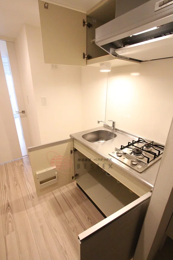 キッチンはガス3口グリル付きのシステムキッチンで、システムキッチンの収納以外にも、背面に備え付けの収納があるので食器類や調理器具の多い方でも使い勝手良好です♪