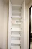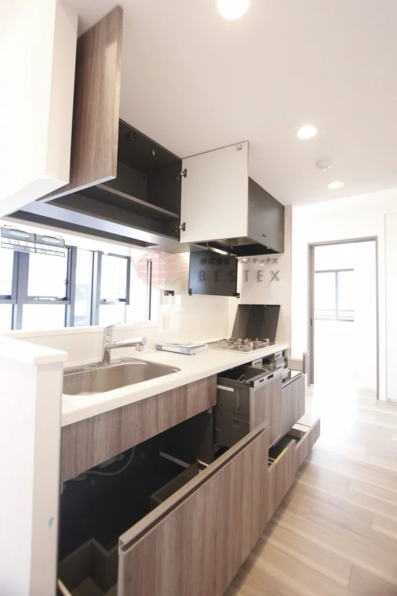 キッチンは、3口ガスコンロでグリルがついているので焼き魚など凝った料理にも挑戦でき、キッチン横には冷蔵庫・電子レンジがおけるので効率的にお料理を進める事ができます。食洗機もあるので洗い物が楽です。