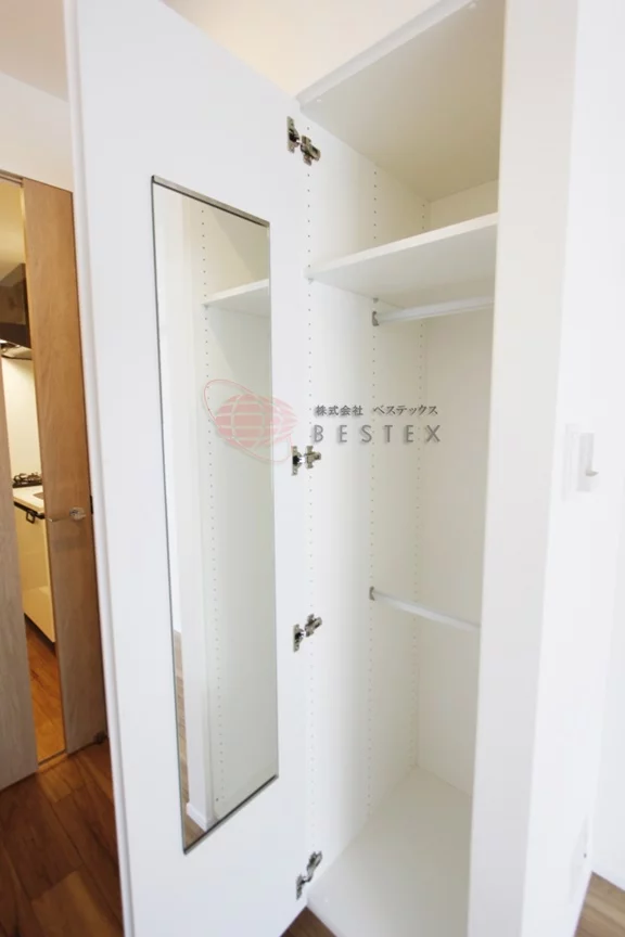 玄関先の廊下には、2口ガスコンロのキッチンがございます。収納スペースも確保されており、キッチン横に冷蔵庫・電子レンジがおけるので効率的にお料理を進める事ができます。また、居室部分とキッチン部分は、扉で仕切られているのでお料理の匂いが気になりません。