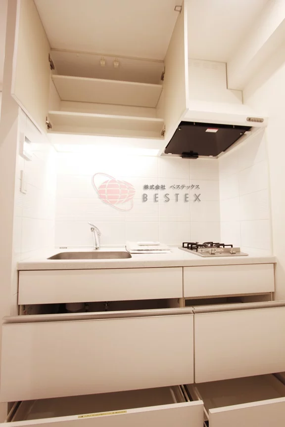 キッチンのスペースもしっかり取られており、使い勝手の良い2口ガスコンロ付きのシステムキッチンで調理スペースや収納スペースも十分に確保されております。また、冷蔵庫・電子レンジもキッチンスペースにおける効率的にお料理を進める事ができます。
