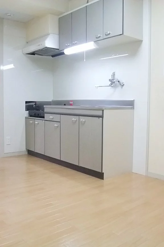 ガスキッチン完備、冷蔵庫は大きさを選ばない作りとなっております。