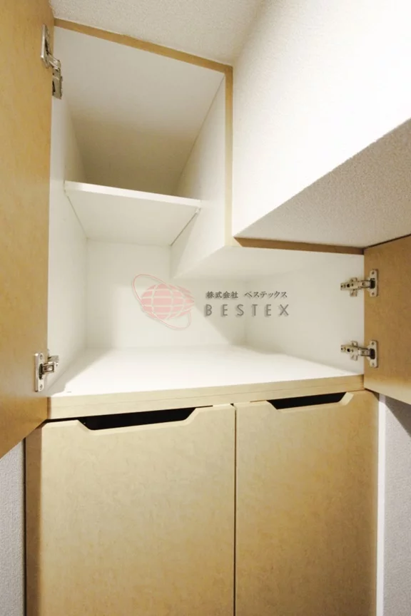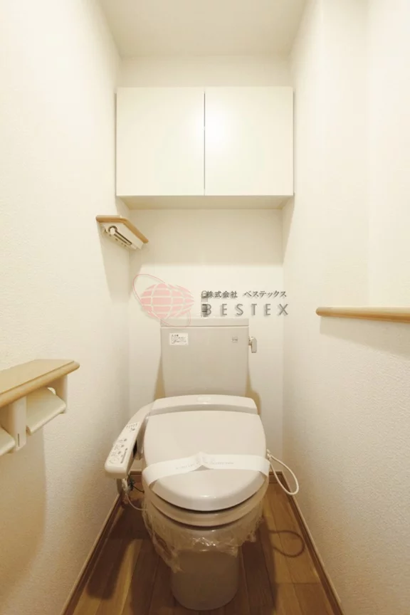 トイレにはウォシュレットも完備。吊り戸棚やカウンターも付いていて便利です。