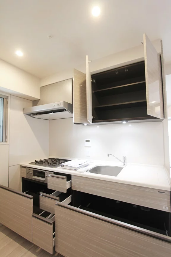 3口ガスコンロキッチンでグリル付きのシステムキッチンとなっております。冷蔵庫・電子レンジもキッチンスペースに置けるので効率的にお料理を進める事ができます。リビングから少し隠れており、小窓も完備しているので換気もバッチリでお料理の匂いも気にならない仕様となっており舞うます。