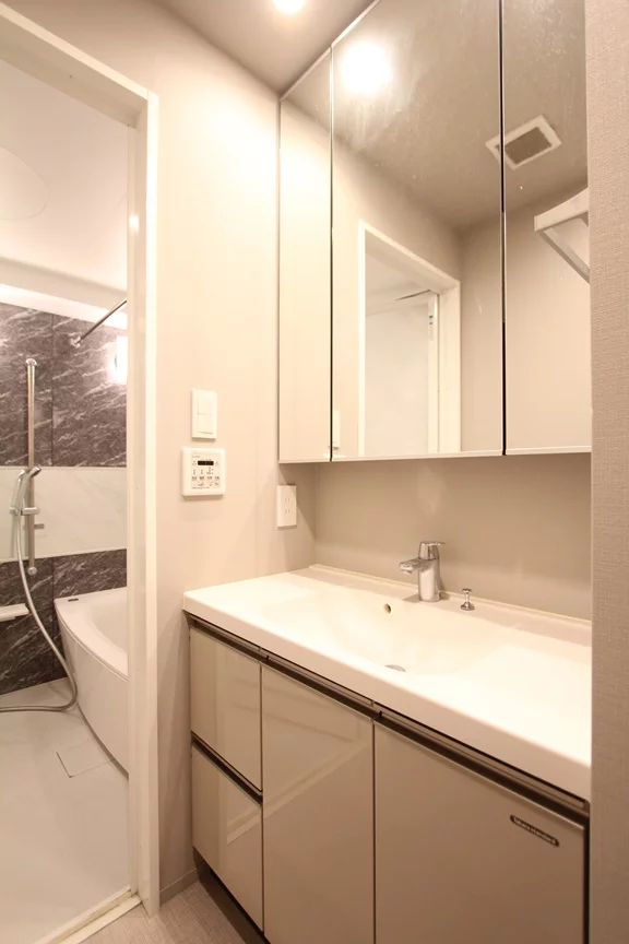 パウダールームもあり、独立洗面台は三面鏡仕様なので朝の準備も捗ります。お風呂には、追い焚き機能、浴室乾燥機能も完備しております。トイレは、ウォシュレット機能付きと機能面でも充実したお部屋となっております。