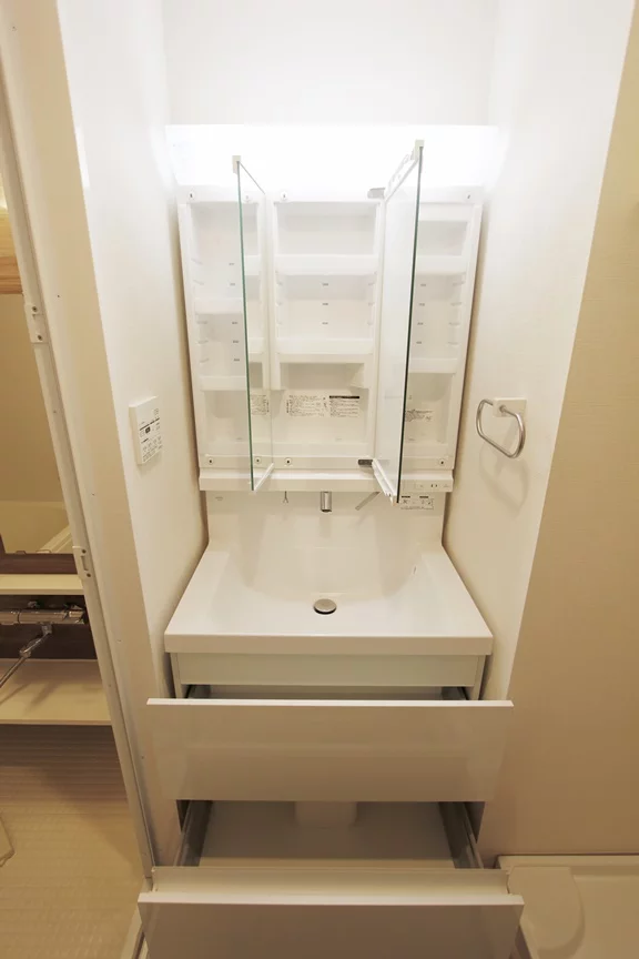 バストイレ別で、追い焚き・浴室乾燥機・暖房・涼風機能付きお風呂と水周りから完全セパレートのウォシュレット機能付きトイレとなっております。人気の独立洗面台も完備しており、三面鏡仕様で鏡の内側にも収納スペースがございます。