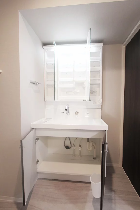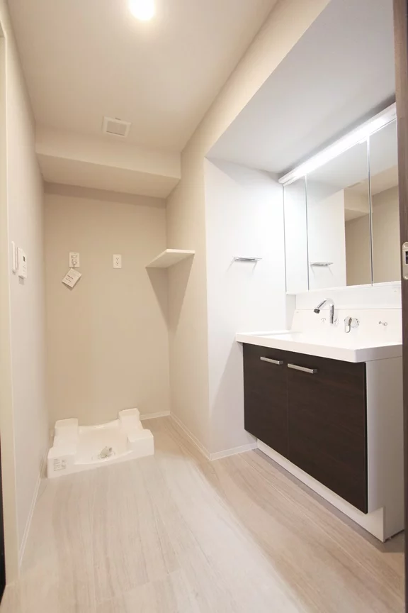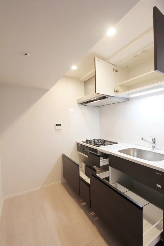 キッチンは、三口ガスコンロのグリル付きなので、焼き魚などの凝ったお料理も挑戦することができます。さらに、キッチンスペースが広く冷蔵庫・電子レンジもキッチン横に置けるので効率的にお料理を進める事ができます。
