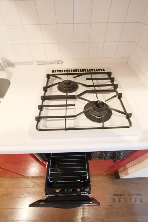 キッチンは使いやすい二口ガスコンロですので自炊をされる方も満足していただけるのではないでしょうか。グリルも付いているので焼き魚も楽しめます。