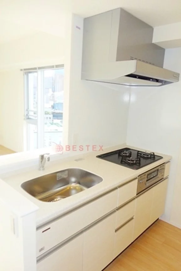 キッチンは3口のガスコンロのシステムキッチンで、人気のカウンタータイプ。