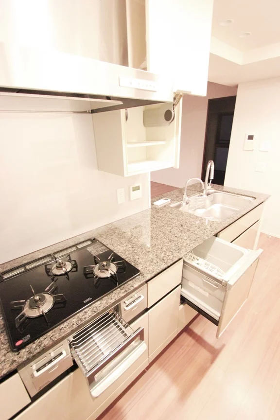 リビングは約12帖と広々空間で家具家電のレイアウトしやすい造りとなっており、湯暖房も完備しております。キッチンは3口ガスコンロでグリル付きのカウンターキッチンで調理スペース・収納スペースを十分にされており、冷蔵庫・電子レンジもキッチンスペースに置けるので効率的にお料理を進めることができます。また、食洗機付きと面倒な洗い物の手助けにもなります。大理石仕様で高級感がございます。