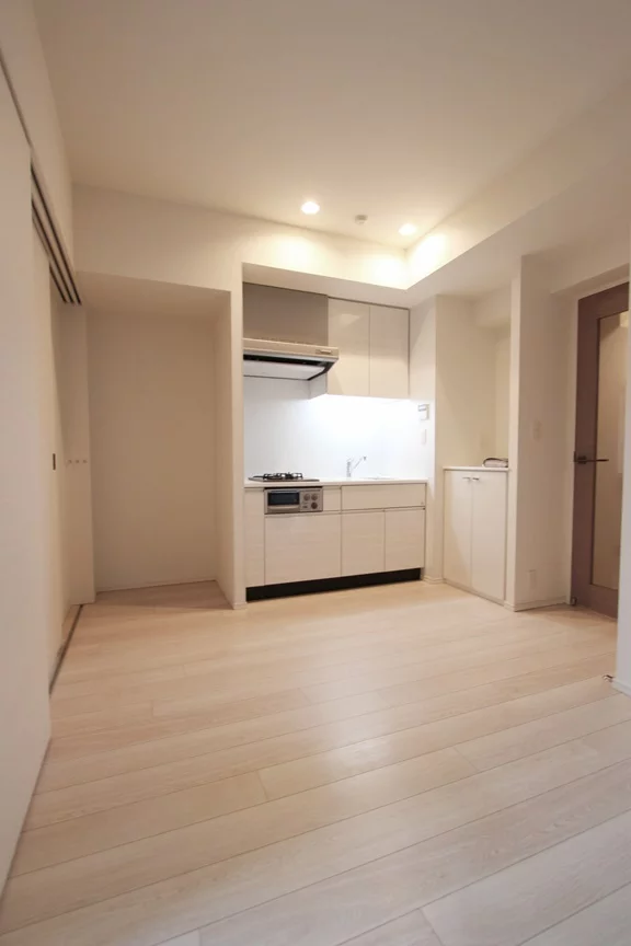ダイニングは、約7.4帖で横長なのでお部屋のレイアウトもしやすくなっております。キッチンは、2口ガスコンロで調理スペース・収納スペースが十分に確保されており、冷蔵庫・電子レンジもキッチン横に置けるので効率的にお料理を進めることができます。
