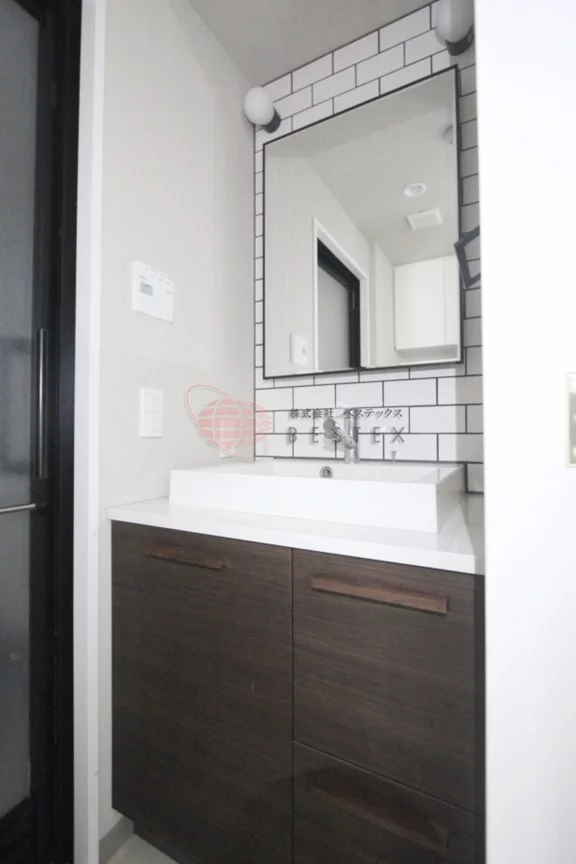 脱衣所の独立洗面台はシャンプードレッサータイプ。見た目もオシャレなタイル張り♪忙しい朝の身支度などもスムーズに行なえます!脱衣所には室内洗濯機置場も設置されています。