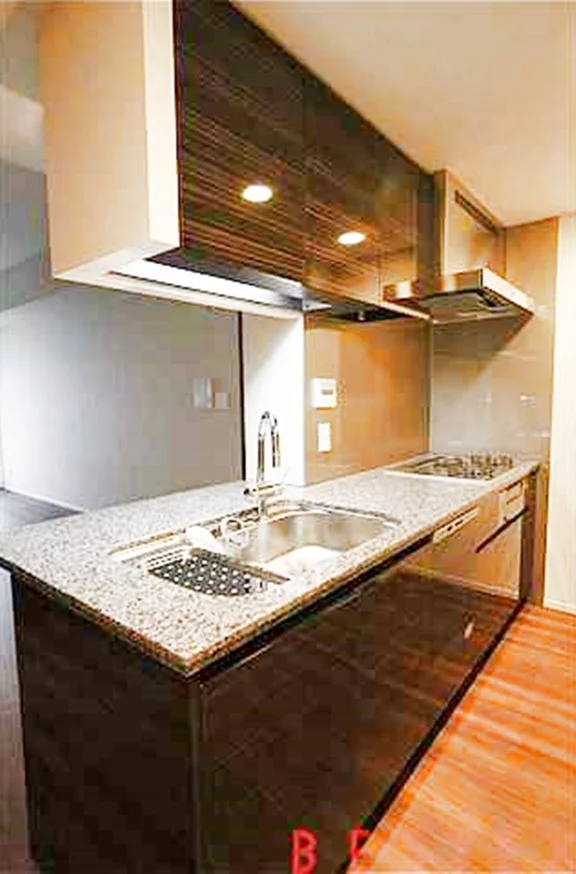 約3.0帖のキッチンは人気のカウンターキッチン!システムキッチンと食器棚、物入と非常に収納豊富♪