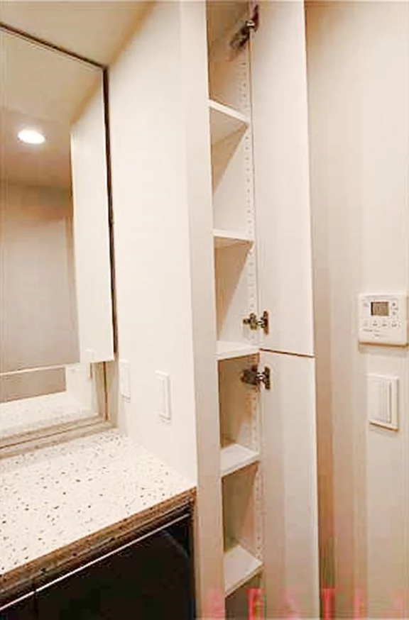 ゆとりのある脱衣所内は独立洗面台、室内洗濯機置場がバランス良く配置。洗面台の横の壁にも棚があるので、独立洗面台の下部収納と合わせて、収納には事欠きません!