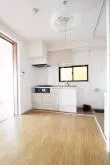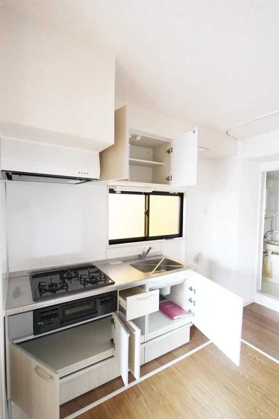 キッチンは、3口ガスコンロでグリル付きで調理スペース・収納スペースも十分にされており、冷蔵庫・電子レンジもキッチンスペースに置けるので効率的にお料理を進めることができます。キッチンには小窓がついているので、お料理の匂いがお部屋に充満する心配はございません。