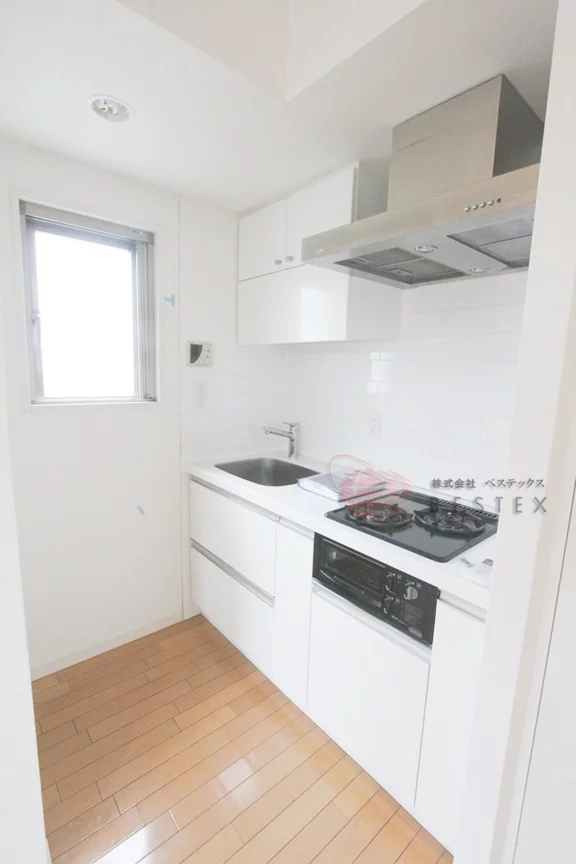 キッチンは2口ガスコンロキッチンで調理スペース・収納スペースも十分に確保されており、冷蔵庫・電子レンジもキッチンスペースに置けるので効率的にお料理を進めることができます。