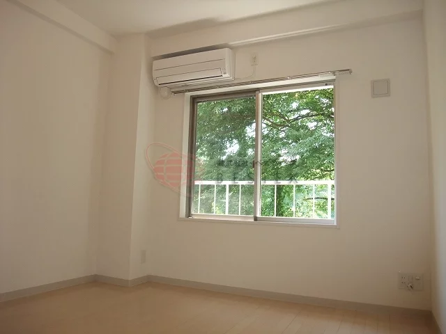 奥の洋室は6.1帖。真四角の間取りなので、家具の配置がしやすくなっています。洋室の端にはクローゼットもあるので、収納にも困りません。エアコンがすでに設置されているので、一年中快適に過ごせます。南向きのお部屋なので、日中の日当たりも良好です。難点があるとすれば、2階という低層階ということ。それとバルコニーがありますが、エアコン室内機置き場となっているため外へは出られない仕様です。ただし家賃の安さやリノベーション物件ということを考えれば、デメリットが目に入らないほどの魅力的なお部屋です。