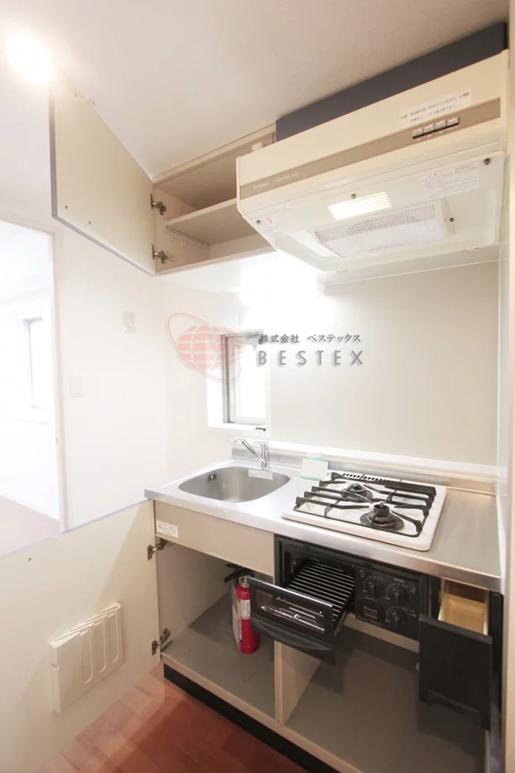 キッチンも2口ガスコンロでお料理も捗りそうです。また居室部分とキッチンが仕切れている1Kタイプなのでお料理の匂いも気にせず生活することができます。