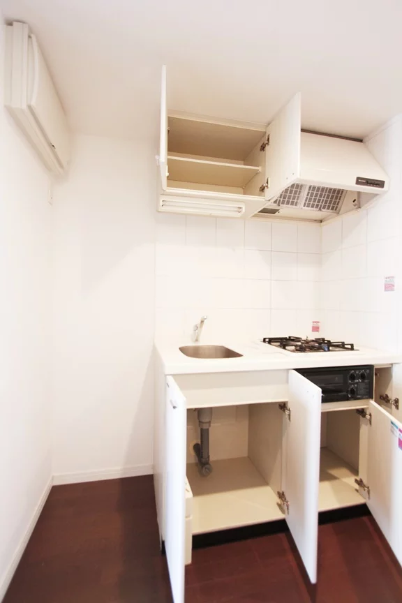 キッチンは、調理スペース・収納スペースが十分に確保されております。2口ガスコンロキッチンで冷蔵庫・電子レンジもキッチン横に置けるので、効率的にお料理を進める事ができます。