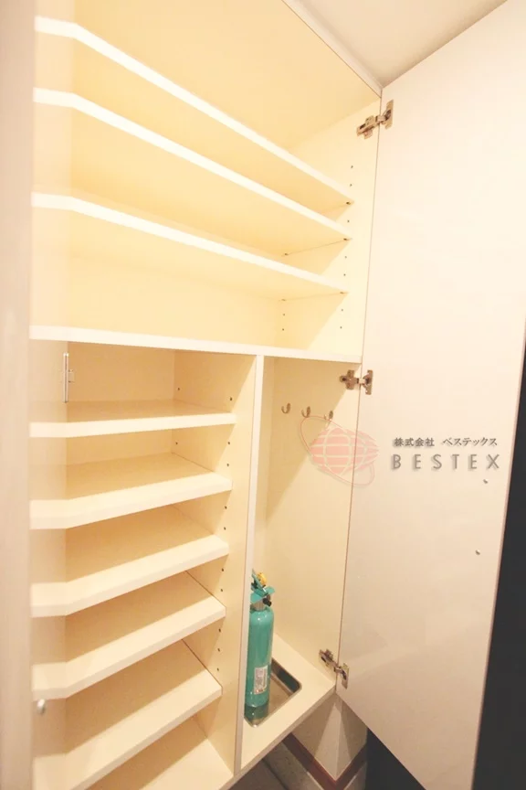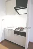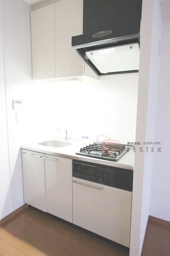 料理好きには嬉しい2口コンロ完備、調理器具を整理できる収納スペースも確保されています。