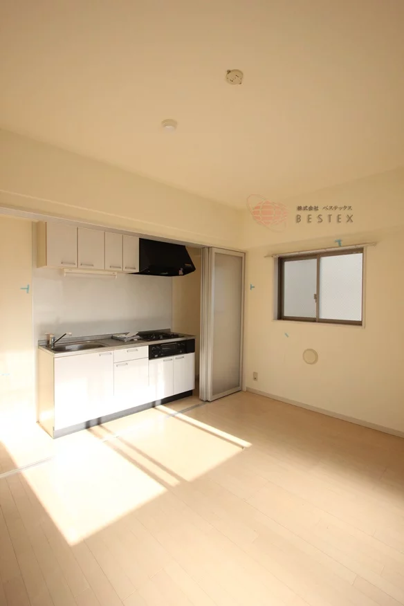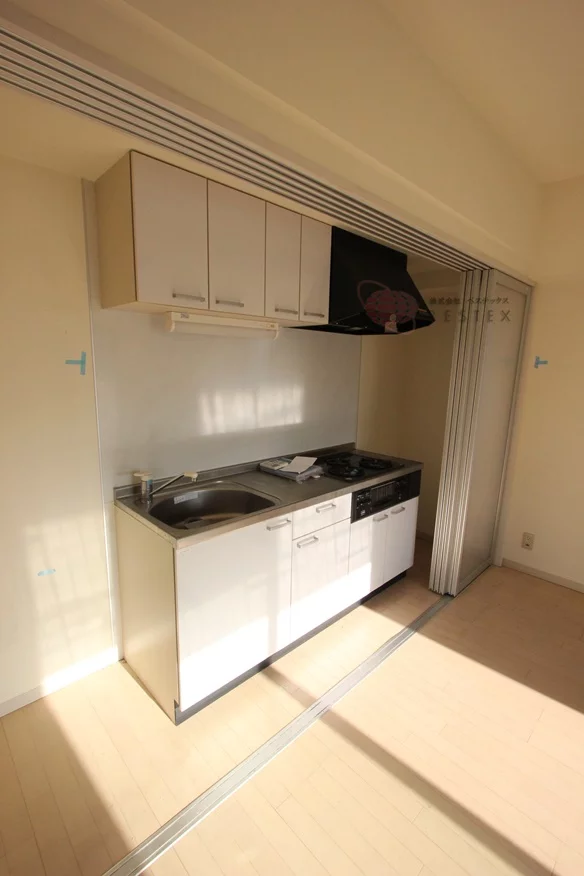 ⓵3口コンロ完備のキッチンはスライド式の扉で隠すことができます!来客時に「キッチン回りを見られたくない…」そんな時に重宝します♪