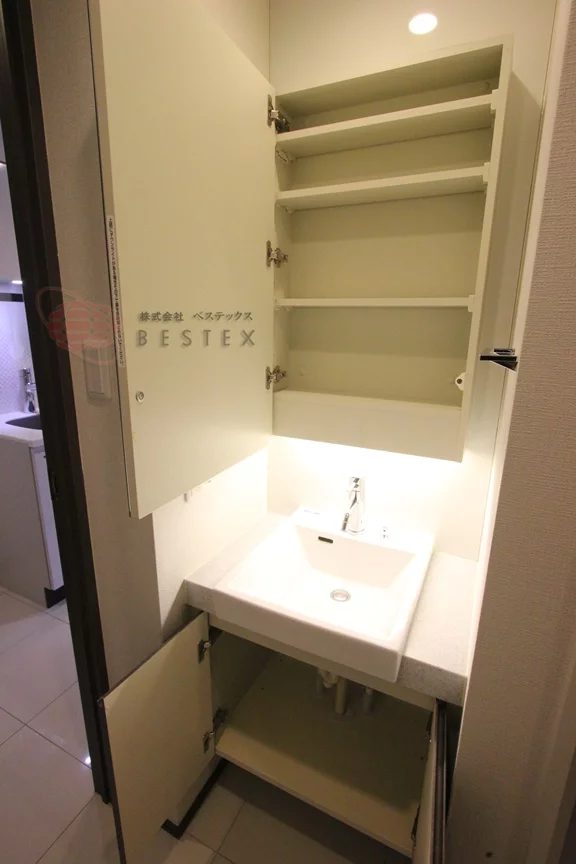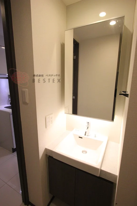 ②.パウダールームには、独立洗面台が完備しており、