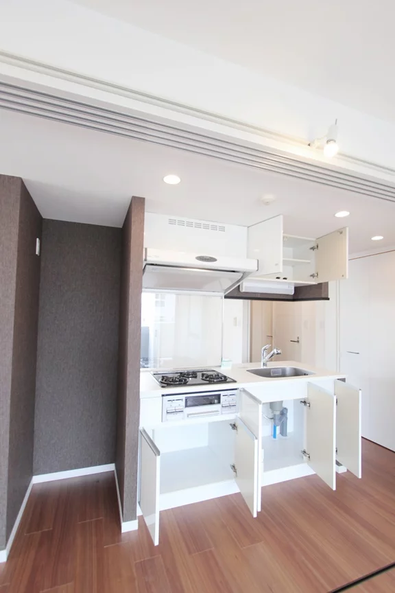 約5.9帖の居室と約11.8帖のリビングの間にキッチンがある類似の少ない独特な間取りとなります。キッチンはアイランドキッチンのような造りで開放感があり、三口ガスコンロでグリル付きと機能面も充実しております。また調理スペース・収納スペースを十分に確保されされており、冷蔵庫・電子レンジもキッチンスペースに置けるの効率的にお料理を進めることができます。